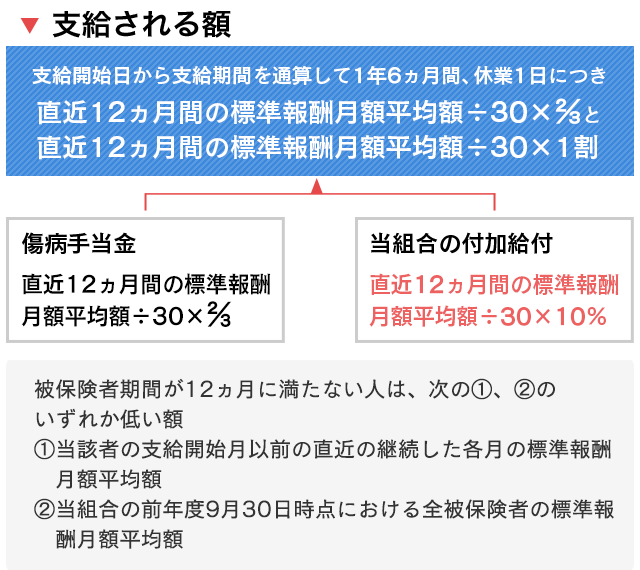 傷病手当金付加金の額は、休業1日につき直近12ヵ月間の標準報酬月額平均額÷30×10%相当額が支給されます。